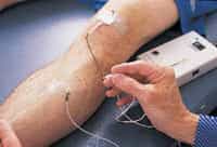 Nella foto in alto a sinistra un paziente si sta sottoponendo all’elettromiogramma al ginocchio. Sopra un set di aghi di varie lunghezze che variano a seconda della profondità  che si vuole ispezionare.